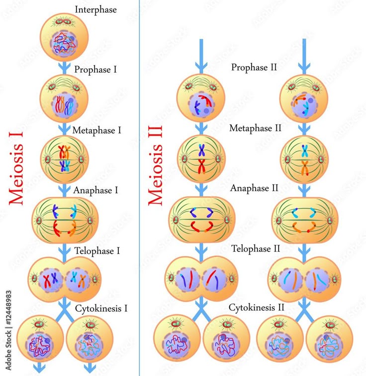 Meiosis works to create four cells, each with a single set of chromosomes within. So, each cell holds 23 chromosomes, instead of 46, which is what our cells carry. This process is known as reduction division, as our gamete cells (sperm, egg) are haploid, rather than diploid.