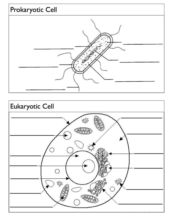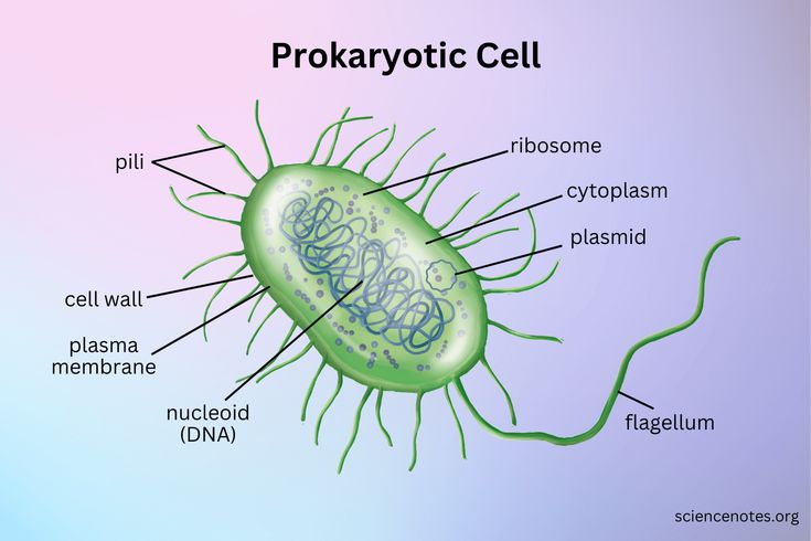 Prokaryotic cells have a flagellum (tail), plasmids, and they also have no nucleus, instead a nucleotide loop.