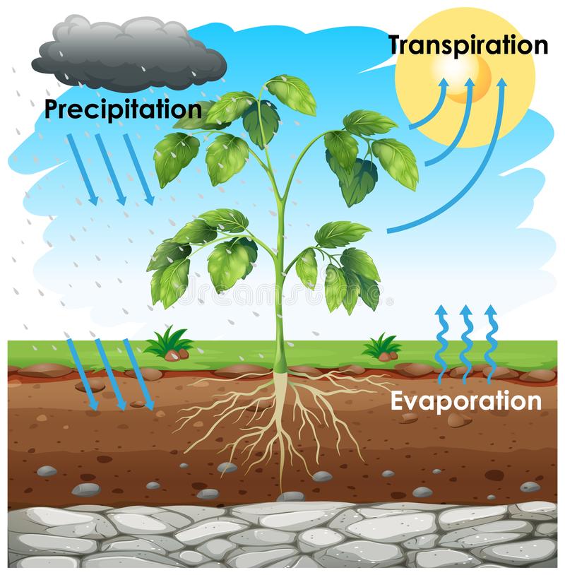 Transpiration is the movement of water through plants. The water travels up through the roots, throught the plant stem and leaves (which uses some of the water in process), and then out through the top of the leaves or branches. This is then attributed to evaporation.