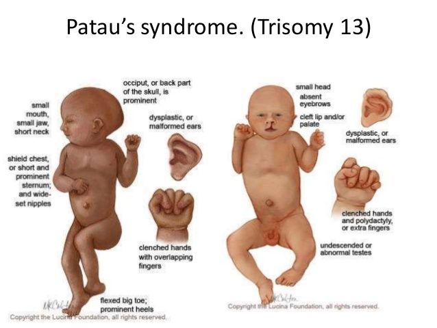 Where each cell normally carries 23 pairs of chromosomes, a baby with Patau's syndrome has 3 copies of chromosome 13, instead of the usual 2. As a result of this, it can mean that the baby is not developed to full term during pregnancy, or can be stillborn.