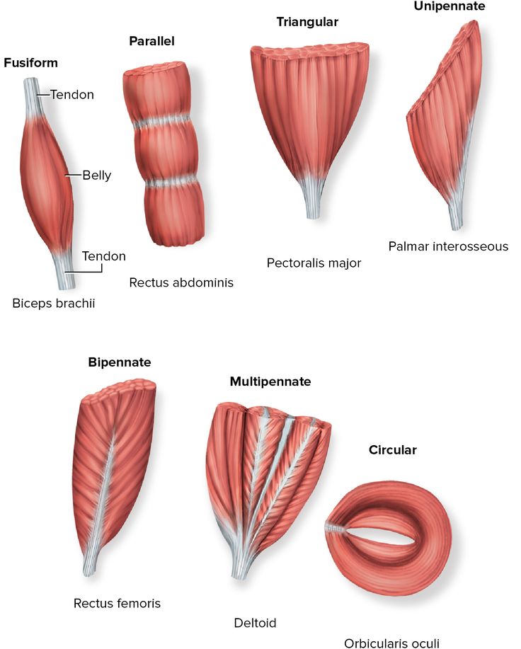 In order to perform at their best, a muscle needs to be the right shape. In the resources on the right, you should see a closeup of the shapes muscles can be. Depending on where they are on our body, depends on their shape. For instance, there are muscles around our eye that open and close our eyelid.