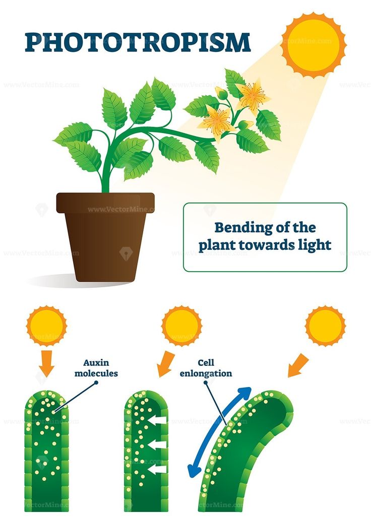 Another tropism is phototropism, which is similar to gravitropism, is phototropism. This is when a plant reacts to a light source. We know they react to sunlight, but in fact, they also react to a strong light. If you were to place a plant into a dark room, it would effectively stop growing. As soon as you place some form of light source, the plant will start to grow.