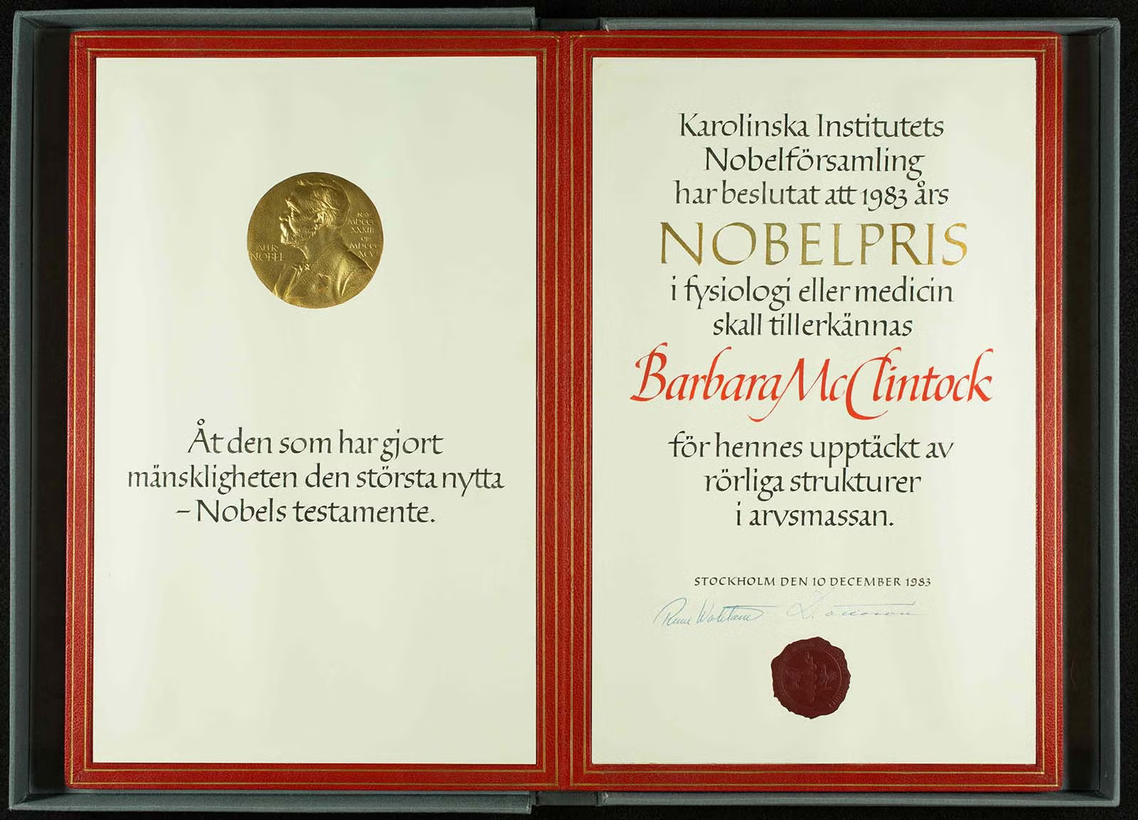 Her life was not without award. She received multiple awards for the work she undertook for cytogenetics. When she retired in 1967 from Carnegie, she was made a Distinguished Service Member, and continued her work. She was the first woman to receive the National Medal of ScienceAn honour bestowed by the President of the United States of America for important contributions in the scientific field. and in 1981 was the first person to receive the "genius" grant, which was then called the MacArthur Foundation Grant. She then won the Nobel Peace Prize in 1983, which was her most notable award, for her work on transposable elements. She was the first woman to receive the award, and the first American woman to win this unshared.